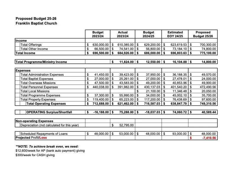 At our church budget meeting on 27th July 2025, the congregation unanimously passed the budget for 2025-2026 as presented below.
